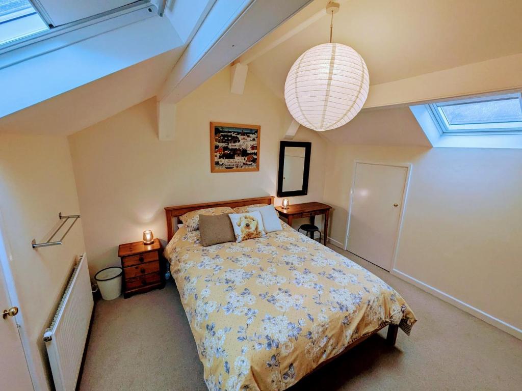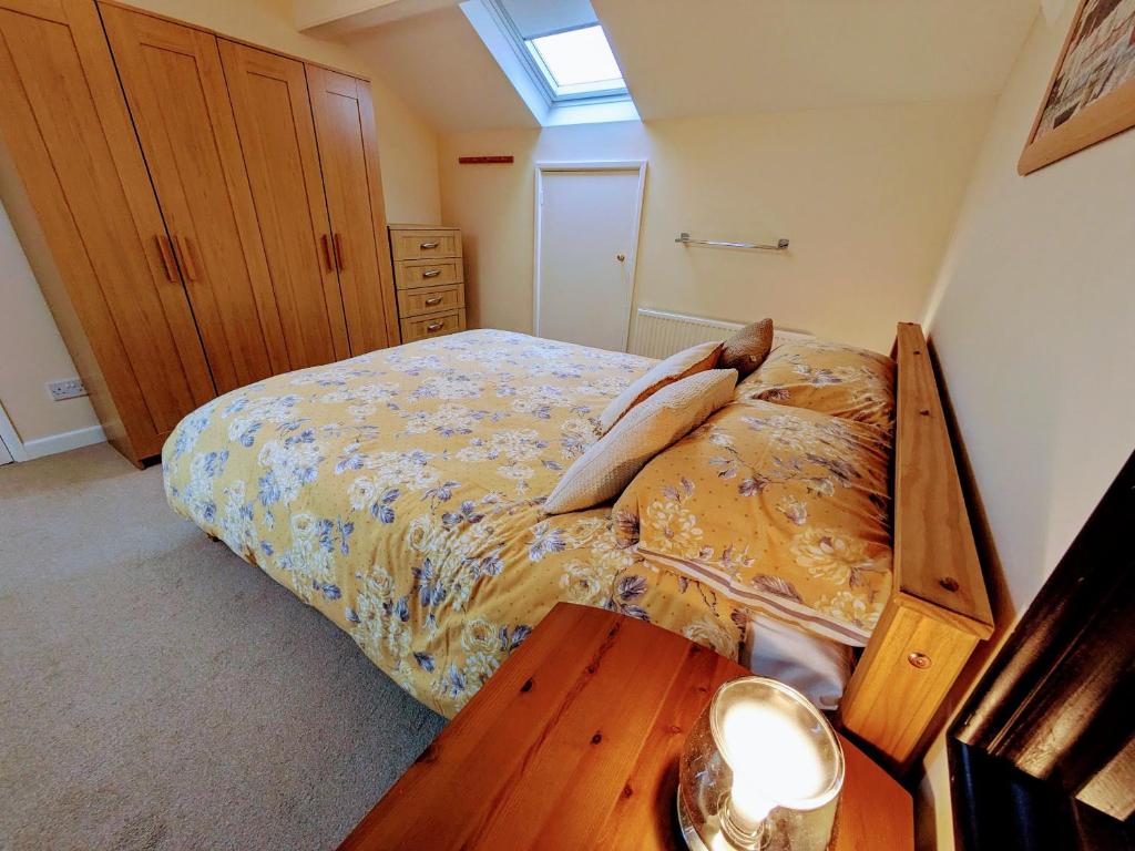 At the top of the second flight of stairs are the two bedrooms. On the right is the Queen size bed with double aspect Velux windows. These allow plenty of light and air into the room whilst maintaining privacy. There are wardrobes, draws and a dressing table to ensure you have all the storage space you need.